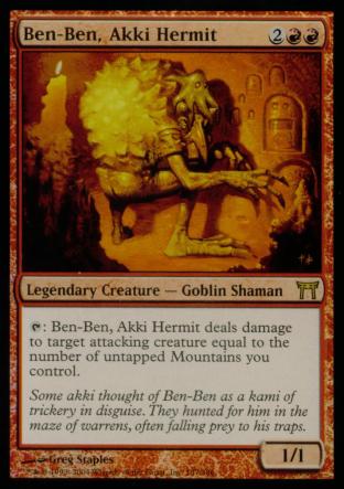 [Tap]: Ben-Ben, Akki Hermit deals damage to target attacking creature equal to the number of untapped mountains you control.
