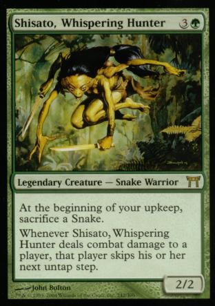 Whenever Shisato, Whispering Hunter deals combat damae to a player, that player skips his or her next untap step.