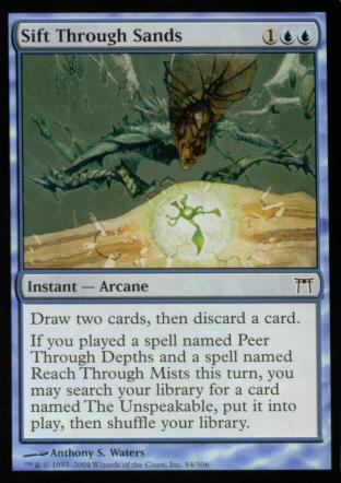 Draw two cards, then discard a card. If you played a card named Peer Through Depths and a card named Reach Through Mists this turn, you may search your library for a card named The Unspeakable, put it into play, and then shuffle your library.