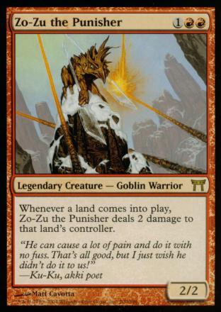 Whenever a land comes into play, Zo-Zu the Punisher deals 2 damage to that land's controller.