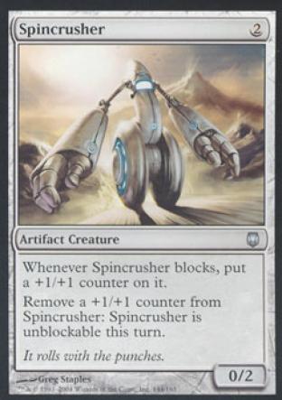 Whenever Spincrusher blocks, put a +1/+1 counter on it. Remove a +1/+1 counter from Spincrusher: Spincrusher is unblockable this turn.