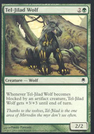 Whenever Tel-Jilad Wolf becomes blocked by an artifact creature, Tel-Jilad Wolf gets +3/+3 until end of turn.
