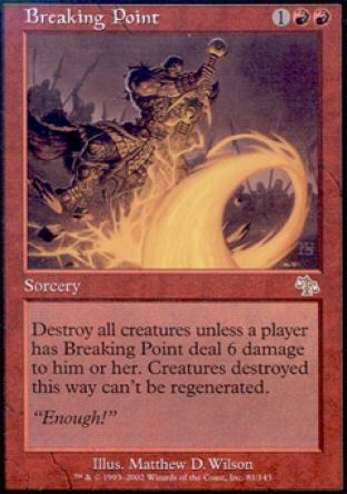 Destroy all creatures unless a player has Breaking Point deal 6 damage to him or her. Creatures destroyed this way can't be regenerated.