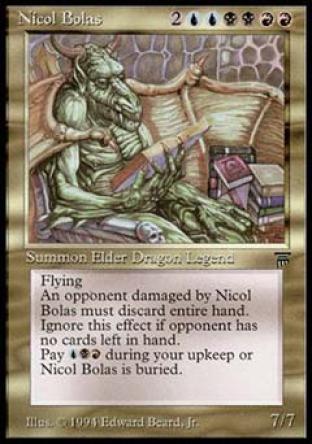 Flying. An opponent damaged by Nicol Bolas must discard entire hand. Ignore this effect if opponent has no cards left in hand. Pay during your upkeep or Nicol Bolas is buried.
